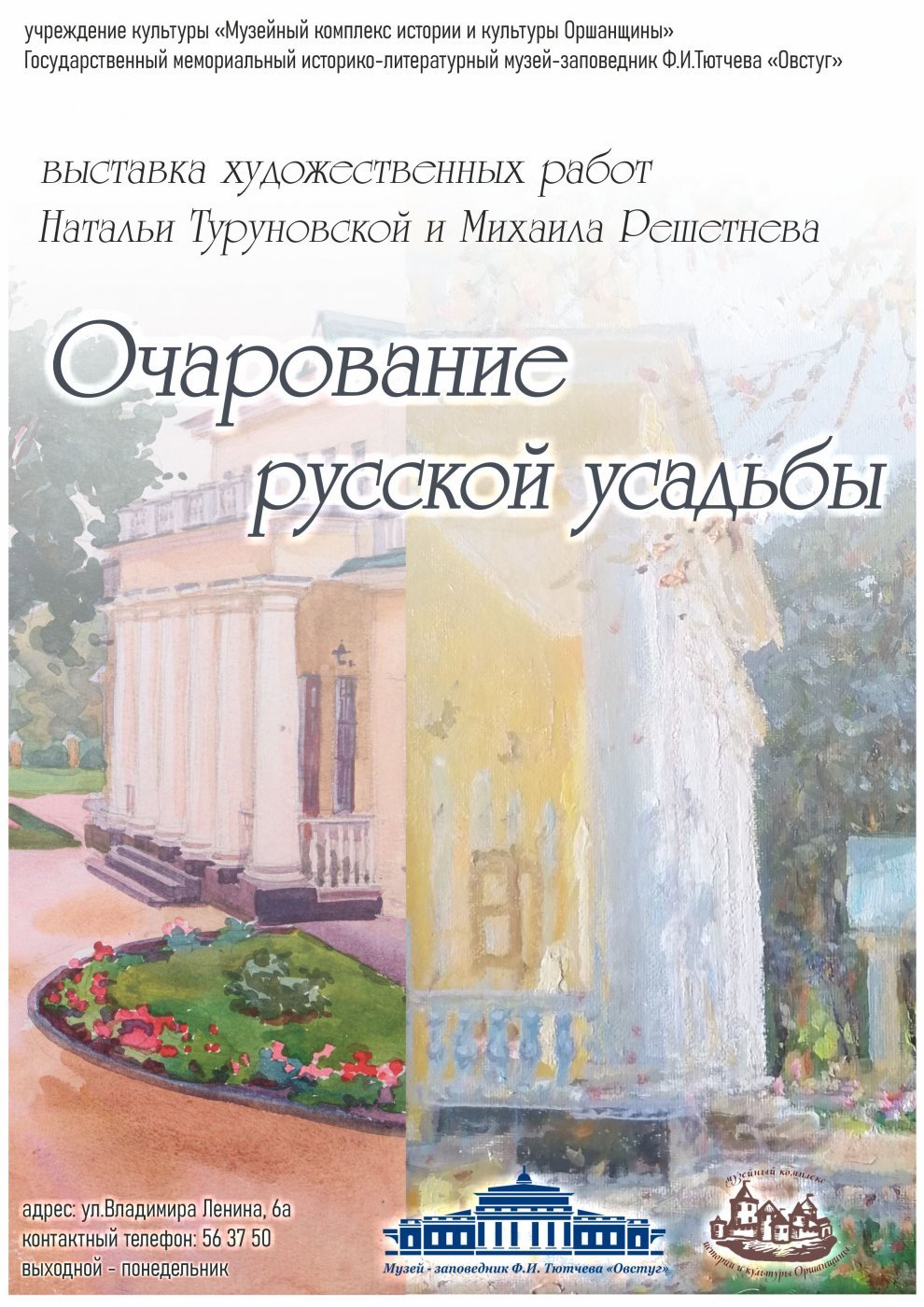 21 сентября 2025 года в 14.00 в Оршанской городской художественной галерее В.А.Громыко состоится торжественное открытие международной выставки художественных работ Н.В.Туруновской и М.С.Решетнёва «Очарование русской усадьбы».
